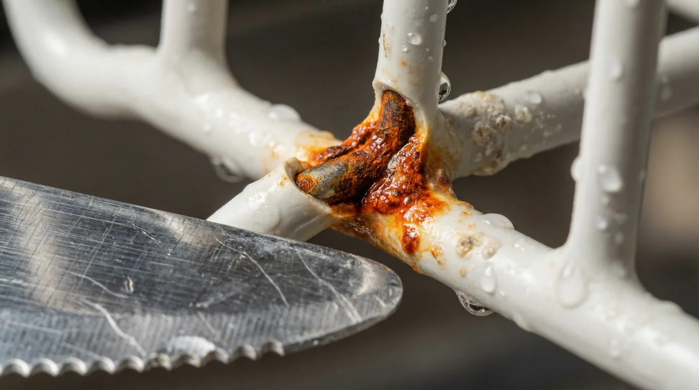 Bulaşık makinesinin sepetleri, esnek bir vinil veya naylon tabakayla kaplanmış çelik iskeletlerden oluşur. Bu yapıyı tıpkı insan derisine benzetebilirsin. Küçücük bir kağıt kesiği normalde zararsızdır; ancak o kesik her gün tuzlu, kaynar sulara ve kimyasallara maruz kalırsa, enfeksiyon kaçınılmazdır. Sepetteki ufak çizikler de tam olarak böyle bir enfeksiyon başlatır.