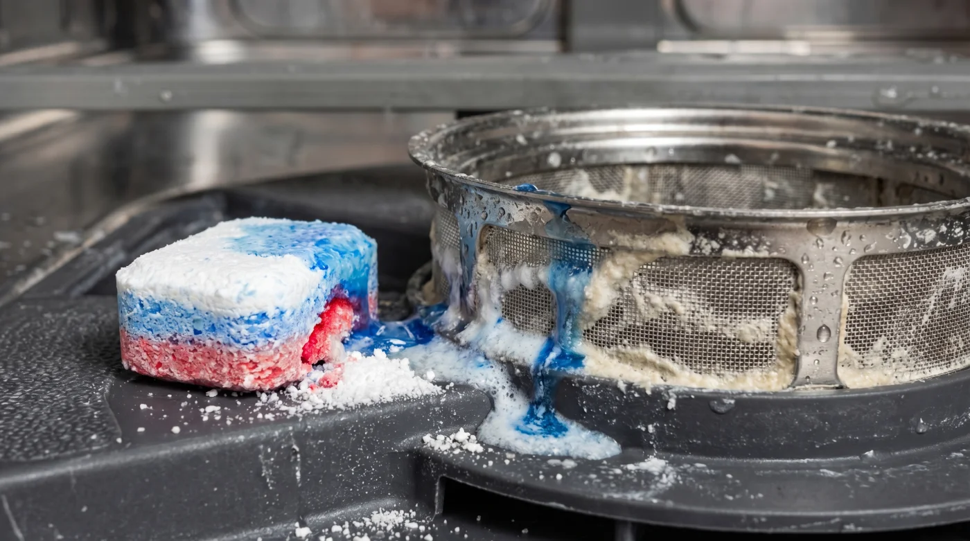 İşte her şeyin ters gittiği an tam olarak burasıdır. Tablet, doğrudan tabanda olduğu için bu ilk suyla hemen reaksiyona girmeye başlar. Deterjanın dış yüzeyi çözülür, içindeki güçlü enzimler ve temizleyiciler henüz yüksek sıcaklığa ulaşmamış suyun içinde ağır, yapışkan bir macun kıvamına gelir.