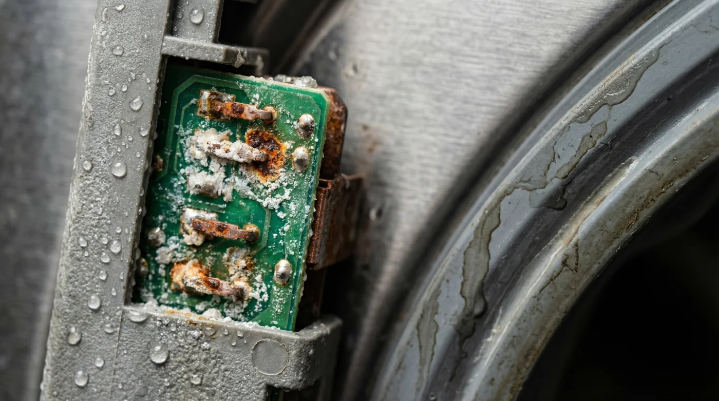 İçeride mahsur kalan o masum sanılan nem, sadece lastik contalarda siyah bir küf tabakası yaratmakla kalmaz. Su buharı, fiziğin temel kuralları gereği yukarı doğru hareket eder ve makinenin en üst kısmında yer alan elektronik kilit mekanizmasına doğru sızar. O basit mandal yuvasının hemen arkasında, milimetrik lehimlerle ve mikroçiplerle dolu hassas bir elektronik ana kart yatar. İçeride hapsolan sıcak buhar soğudukça bu kartın üzerinde yoğuşur. Çamaşır makineni dışarıdan koruduğunu sanırken, aslında kendi ellerinle o mekanizmayı içeriden paslandırıyor ve bir kısa devreye zemin hazırlıyorsun.