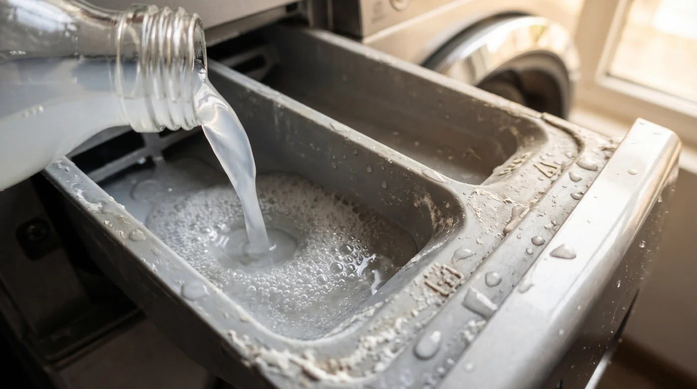 İşte bu noktada sorunu çözmek için bakış açını tamamen tersine çevirmen gerekiyor. Amacımız o yapışkan tabakaya yeni bir kimyasal eklemek değil, onu çözüp atmak. Beyaz sirke, mutfak tezgahlarından çıkıp çamaşır makinesinin o gizli çekmecesine döküldüğünde, içerideki rutubet kokusunu tek yıkamada söküp atan doğal bir asit görevi görüyor. O sıradan, ucuz sıvı, makinenin metalik doğasına en büyük iyiliği yapıyor.
